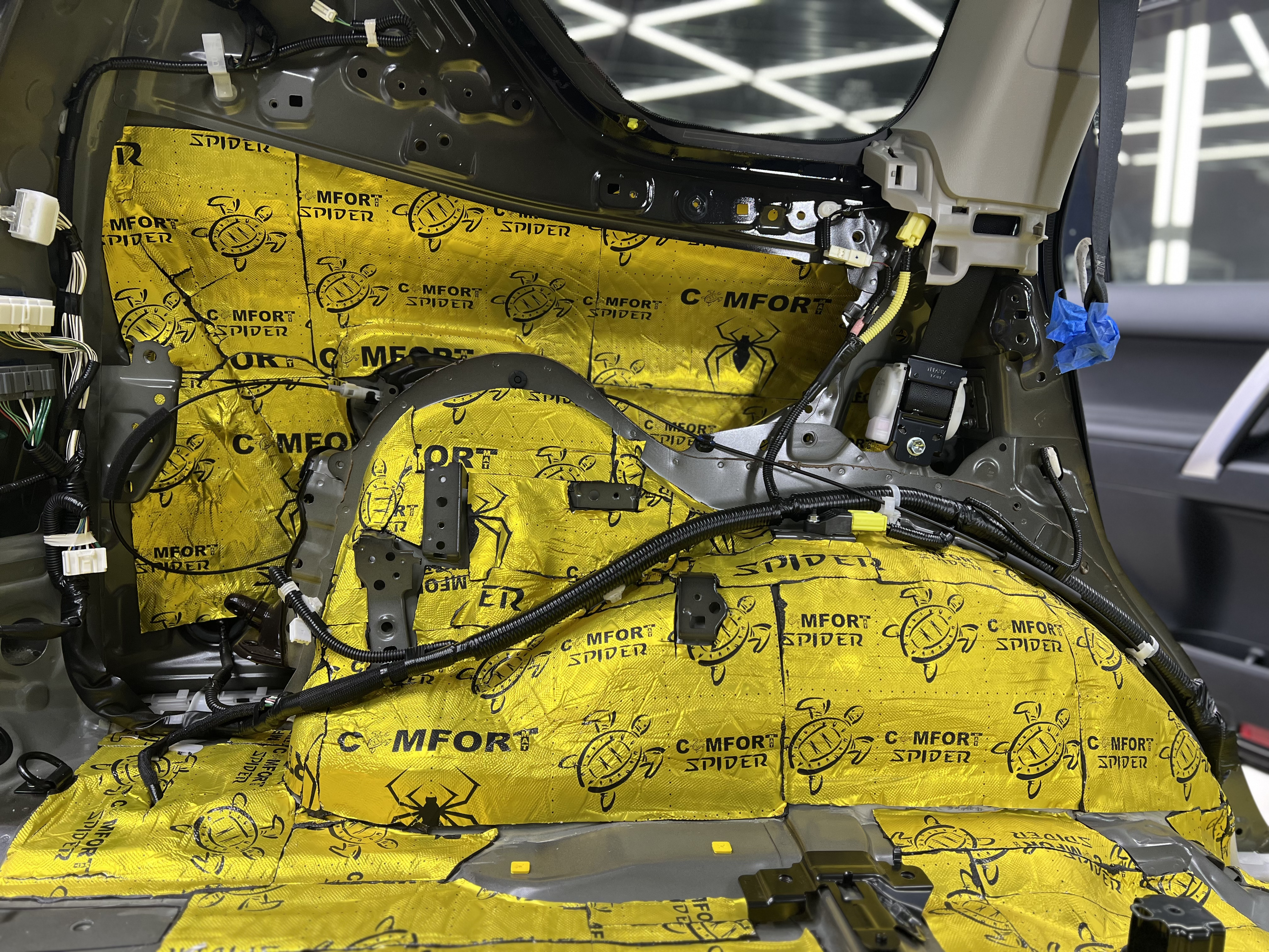 Первым слоем нанесли Виброизоляцию Comfort Mat Spider, которая эффективно гасит вибрации кузова. На снимке виден готовый слой Spider, плотно наклеенный на дно салона и багажник, обеспечивающий прочную основу. Особое внимание уделили стенкам багажника, где также применили Comfort Mat Spider.