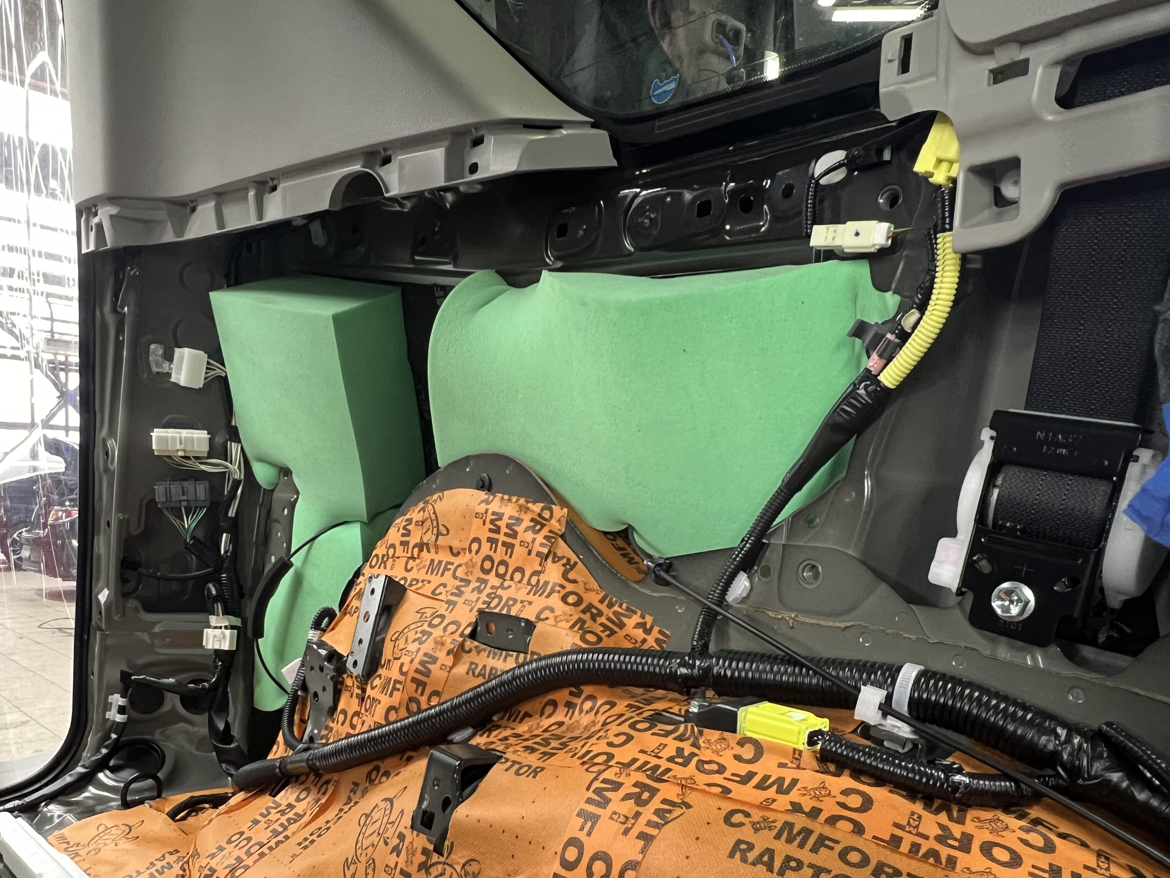 Вторым слоем на днище уложили Шумоизоляцию Comfort Mat Raptor, поглощающую шумы средней и высокой частоты. Готовый второй слой Comfort Mat Raptor полностью покрыл дно салона.
