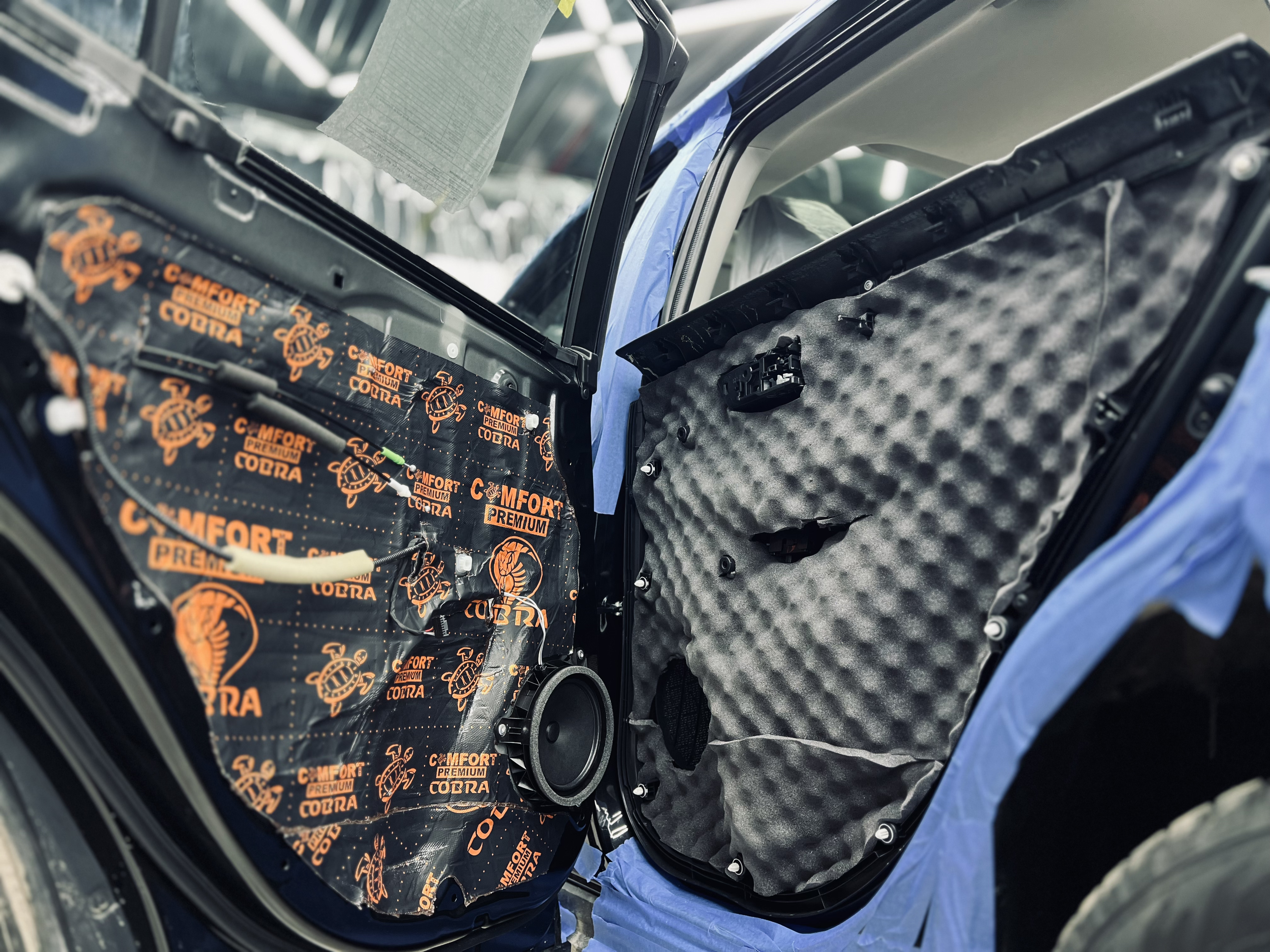 Первым слоем на двери и дверь багажника нанесли виброизоляцию Comfort Mat Dark Cobra, которую аккуратно подрезали для идеального прилегания.