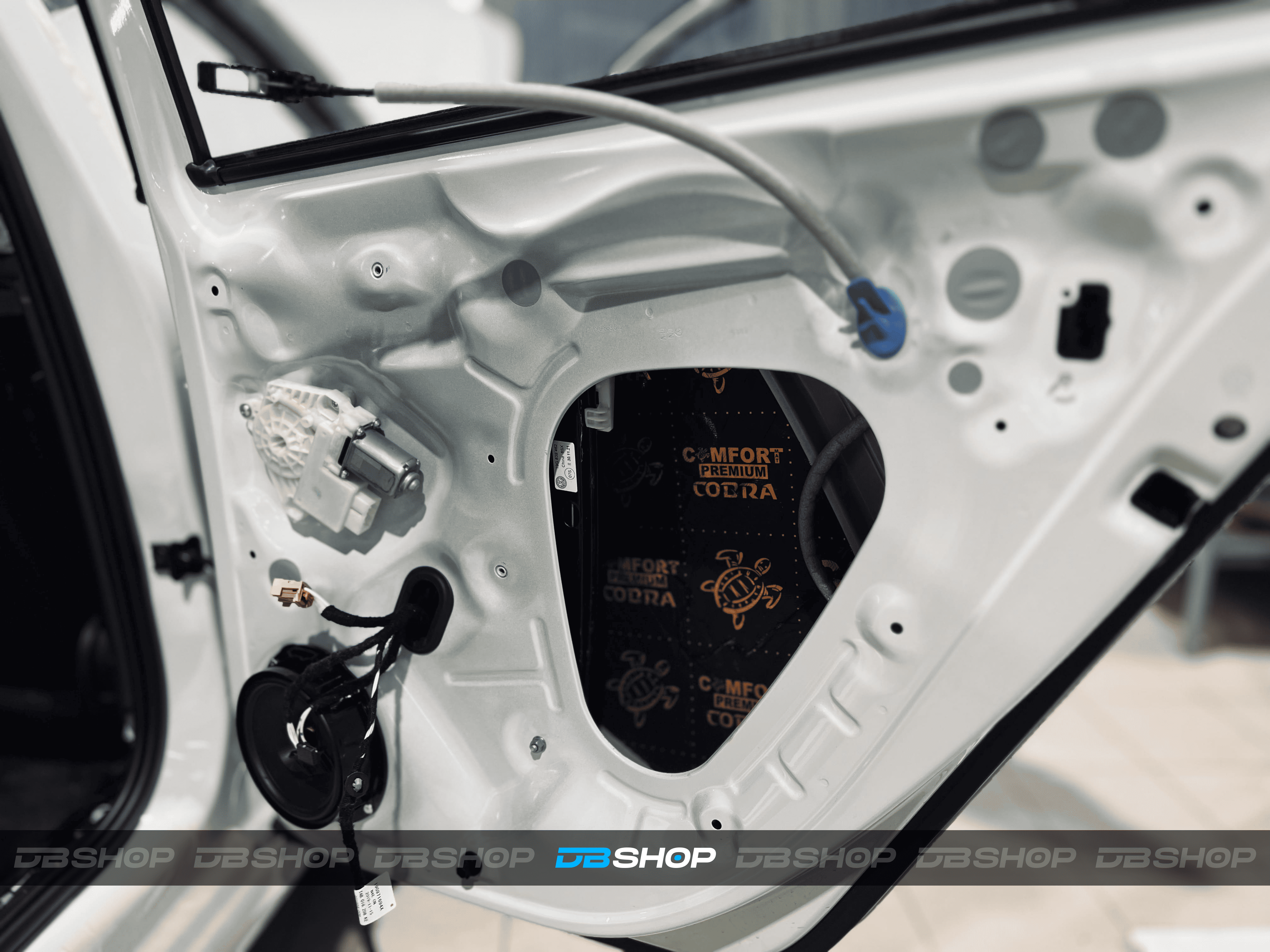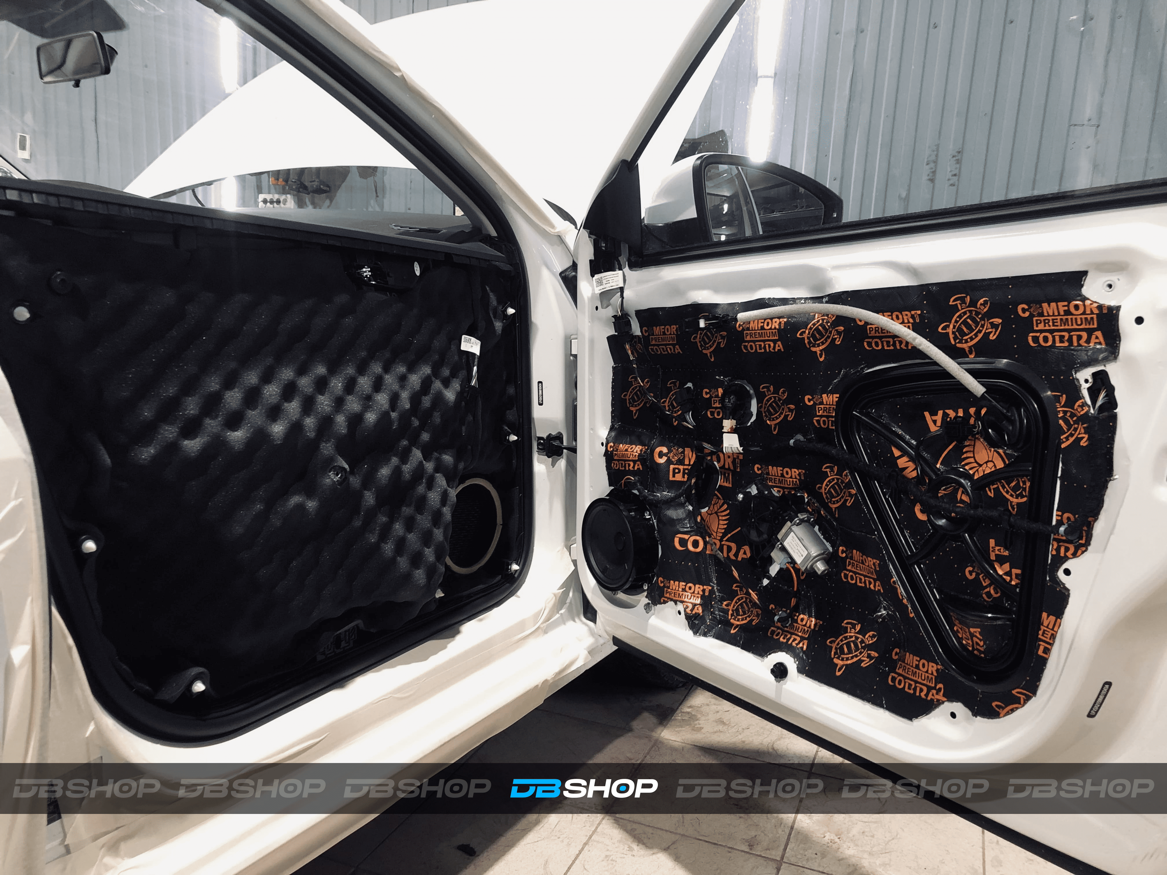 На каркас двери нанесли виброизоляцию Comfort Mat Premium Cobra и шумопоглощающие волны Comfort Mat Тишина Volna для более качественного поглощения сторонних звуков. Багажник также завершили этим мягким материалом Volna.